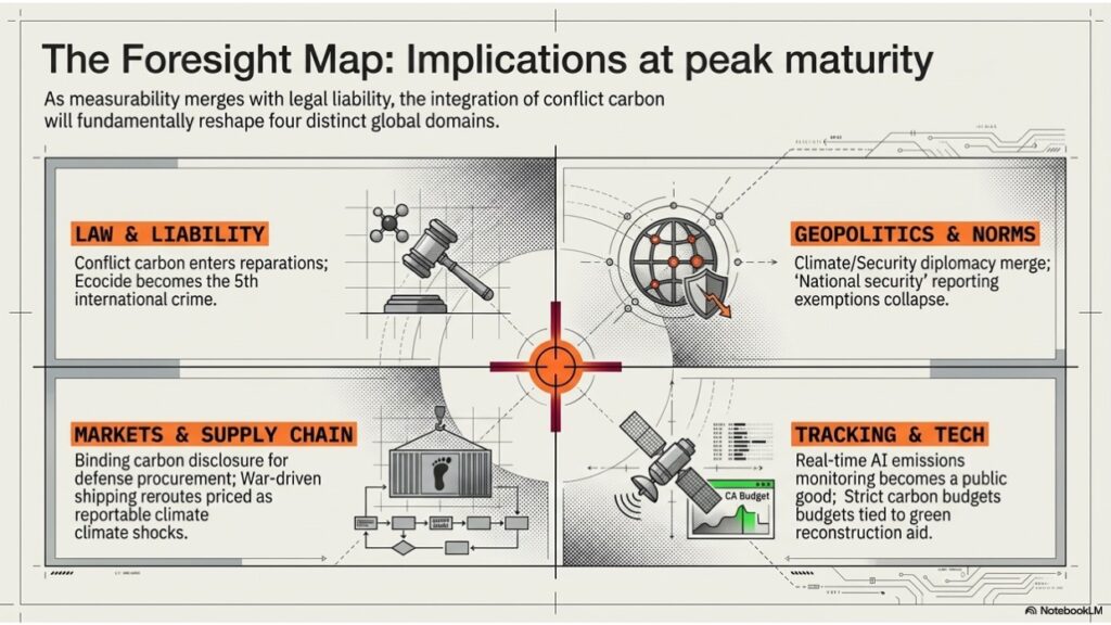2. Conflict carbon liability enters reparations law. Following the Ukraine precedent, post-conflict settlements routinely include climate compensation claims. Insurance and sovereign debt markets begin pricing war-related carbon exposure.
