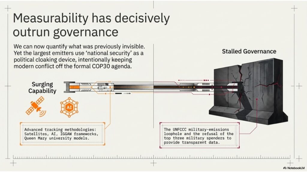 The paradox is that our capacity to measure has already surpassed our capacity to govern. What once remained invisible can now be quantified with increasing precision, yet the world’s three largest military spenders — the United States, China, and Russia — still do not transparently report military emissions to the UNFCCC, while conflict emissions remain absent from the formal agenda of COP30. In practice, the language of “national security” operates as a political cloak, shielding from scrutiny what is, in sheer volume, a major category of emissions. Most people fail to see this, not because the evidence is missing, but because war is still narrated as a matter of security or humanitarian crisis, never as a climate event — even when oil is burning in the streets of a city of fourteen million.