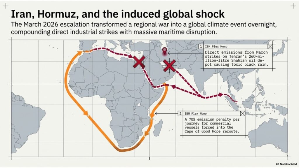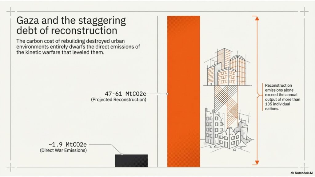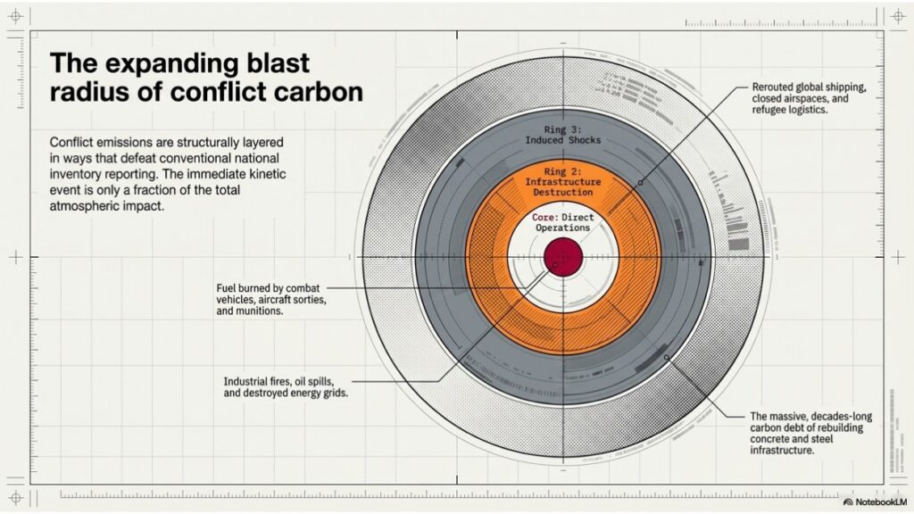 War has become a hidden engine of the climate crisis. It burns through cities, fuel depots, supply chains, and futures, releasing emissions on a scale comparable to civilian aviation and shipping combined — yet it still slips through the ledgers of global accountability. From the oil fires of Tehran to the ruins and reconstruction of Gaza, from Ukraine’s vast carbon burden to Sudan’s near-total atmospheric silence, modern conflict leaves not one plume but many: from combat, destruction, displacement, rerouted trade, and the long afterlife of rebuilding. The means to count these emissions now exist. What does not yet exist is a political order willing to see them clearly. In the widening gap between measurement and recognition, between evidence and institution, the climate politics of war is already being written.